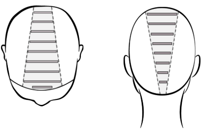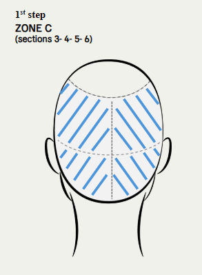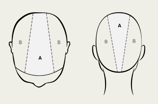 ZONA A: Crea una sezione triangolare, tracciando la riga dai recessi temporali fino al centro della nuca. I lati formeranno la ZONA B.
