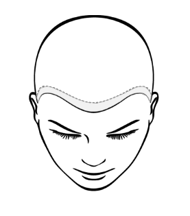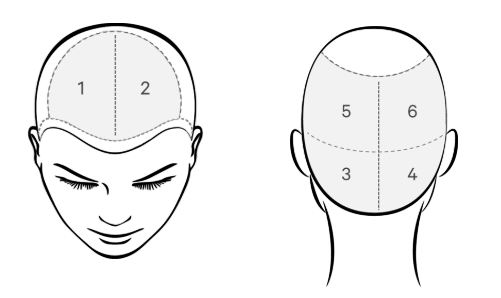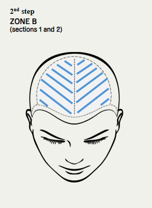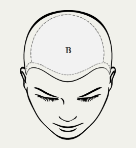 ZONA B: Traccia una curva a partire dalla tempia, estendendola sopra la zona parietale, sotto la parte inferiore del vertice fino alla zona parietale opposta, e concludendo alla tempia opposta.